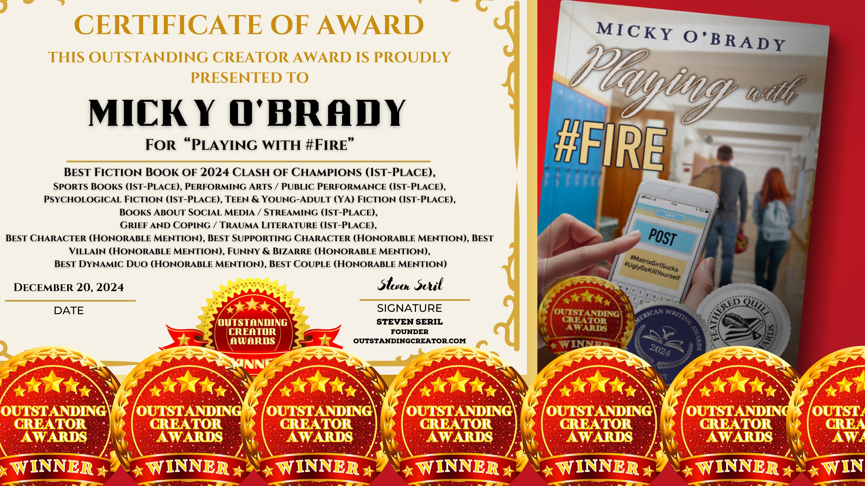Micky O’Brady’s Playing with #Fire is a beautifully written and compelling story about a teen’s recovery from social media bullying and her experiences in the world of pro-wrestling. O’Brady’s plot is marvelous and has something for everyone. There’s a compelling romance, the dark vision of a horde of bullies masquerading as high school seniors, and the mystery behind a badly burned classmate whose very presence seems to inspire his peers to physically abuse him at every opportunity. Watching Everly navigate her parental issues while staying above the small-mindedness and meanness of high school is fascinating, but not nearly as much as her introduction to pro-wrestling. I was enthralled reading about the training she receives under the tutelage of Fire, Ben Bullet’s assistant, and loved learning about a sport I had previously no interest in. Playing with #Fire is a joy to read; one of those books that get you wrapped up in the story and reluctant to come up for air. It’s most highly recommended.